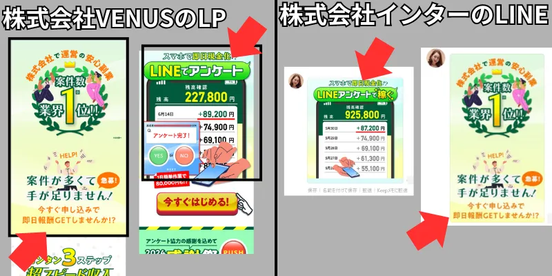 株式会社インターの副業LINEで簡単アンケートLPには無かった画像が送られてきました。株式会社VENUSの副業LPと全く同じ画像です。これは紛れもなく株式会社VENUSの焼き増し案件で確定しそうですね。