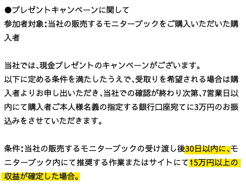 モニターブック(1,980円)の参考ページすら閲覧できないため、どのような内容が記載されているのか不明な状態で購入する事になります。さらに購入しなければ副業が始められないためほぼ強制に近い形で購入すると言っても過言ではありません。そんな状態で返金不可は貪欲が過ぎますね。