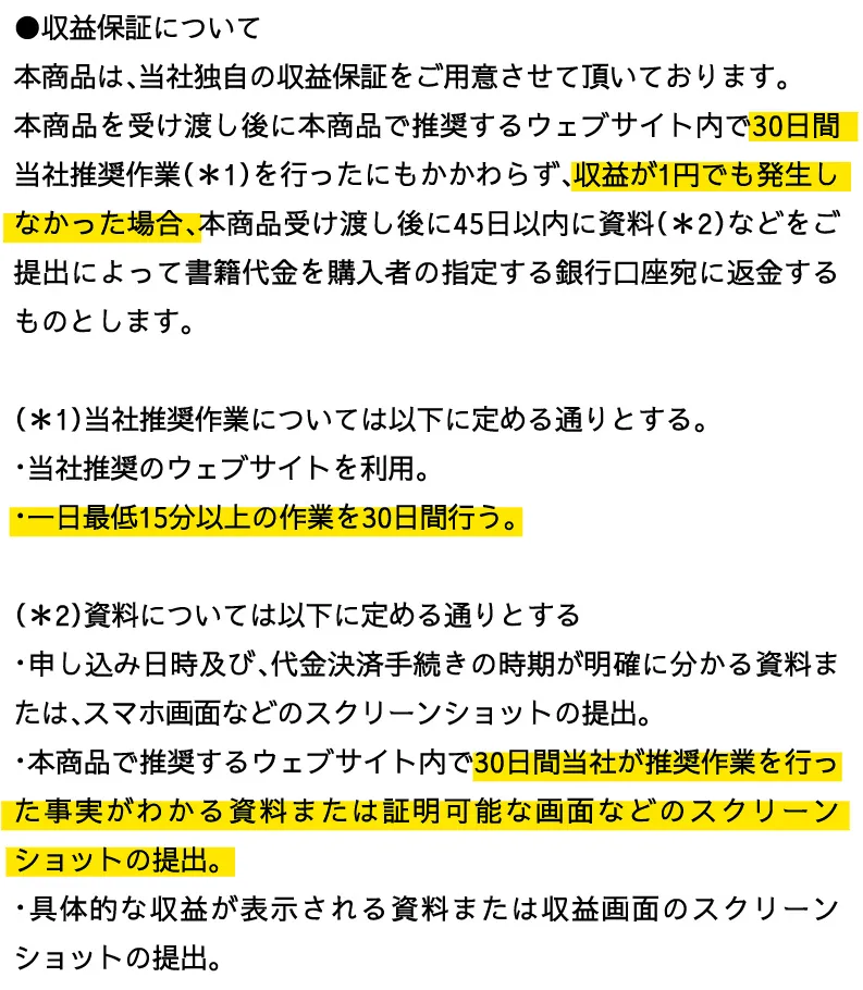 要約すると1日15分以上の作業を30日間行い1円も収益が出なかった場合、30日間の作業内容の資料又はスクリーンショットを提出するとのことでした。1日8万円と大口を叩きながら30日間利益が1円も出なかった場合のみ保証するとは聞いて呆れますね。
