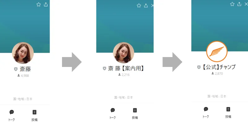 LINE友達登録を3回行い、斎藤【案内用】と主にメッセージを続けていくようです。そして3回目のLINE友達登録で【公式】チャンプが現れました。私が登録し一切メッセージの返答がなかった株式会社VENUSの副業と同じ名前同じアイコンでした。