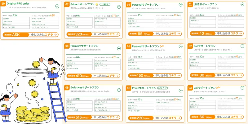 30万円のプランから電話サポートが追加されるため10万円のプランはLINEサポートのみ。10万円払ってLINEのみって厳しすぎませんか?