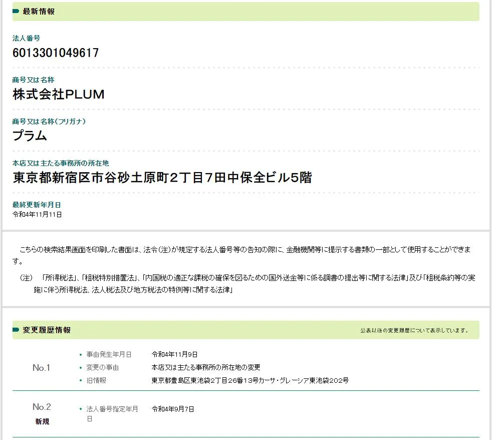 2022年9月7日に法人番号指定されたばかりの新しい会社だと判明しました。