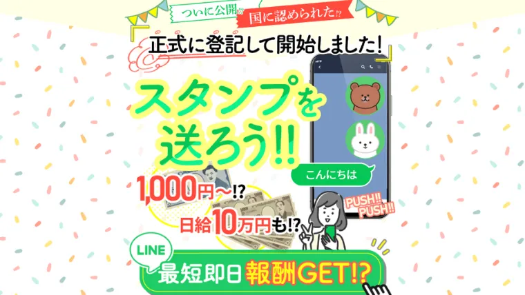 サイトでは、スタンプを送ると1000円~日給10万円と宣伝を行っています。
