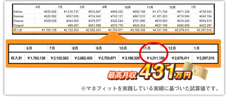 収益実績に記載されてる「Adnico」「Seesaa」「Weaver」「Waqool」は、アフィリエイト業者の名称です。