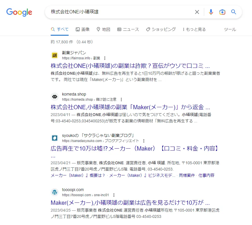 株式会社ONE/小礒瑛雄の口コミを調べましたが、”稼げた”という声は1つも見つかりませんでした。