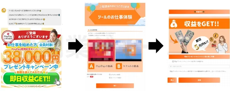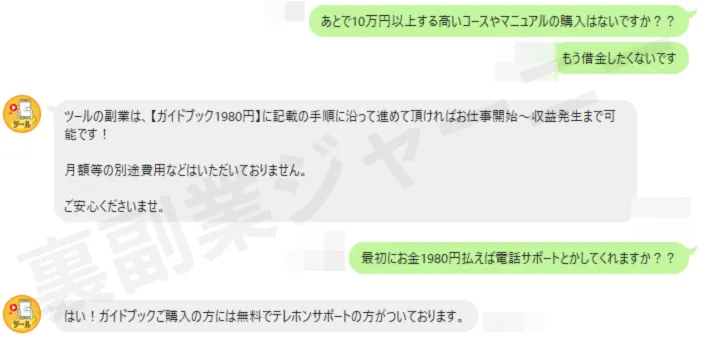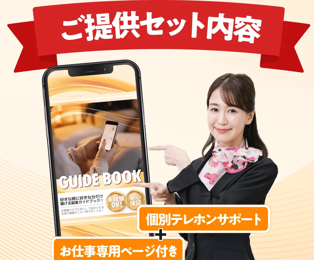 個別テレホンサポートとありますがガイドブックを購入後はスタッフと通話し高額プランへ誘導されます。高いプランほど稼げるなど巧みな言葉で契約させられてしまいます。悪質な場合は借金してまで契約させられてしまうため、注意が必要です。