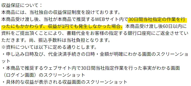つまり1円でも収益が出た場合は保証対象から外れるという事です。さらに30日間1日も欠かさず作業をしなければなりません。気軽に始めれる副業のはずが30日も作業を強いられるとはストレスになりそうです。