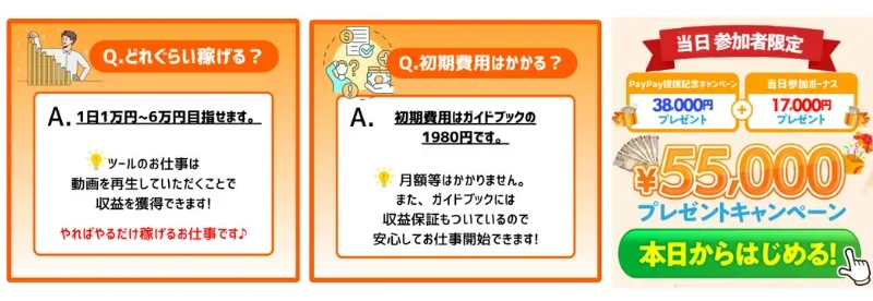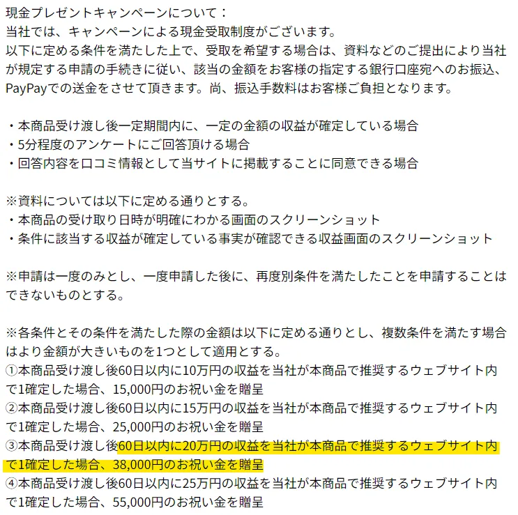 1,980円のガイドブックを購入し38,000円のプレゼントキャンペーンで現金をもらえば、副業せずともプラスになりますよね。そのような現金を配るだけの優しい企業ではありません。38,000円もらうには条件がありました。