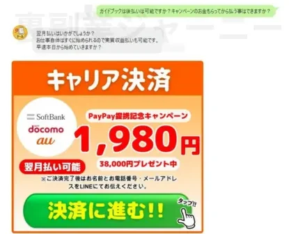 株式会社オリジナルでは最初にガイドブック(1,980円)の購入が必須条件です。銀行振込やコンビニ決済が選択でき、後払いはできません。後払いの代わりになるのがキャリア決済の翌月支払いのようです。
