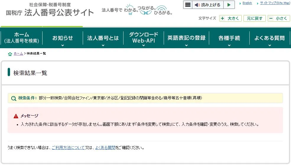 国税庁の法人番号公表サイトから合同会社ファインを検索しましたが、サイト記載住所の会社は見つかりませんでした。