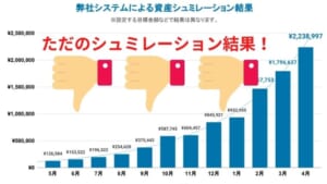 公式サイトには「資産シュミレーション結果」が掲載されており、約1年で12万円の資産が220万円に増大しています。