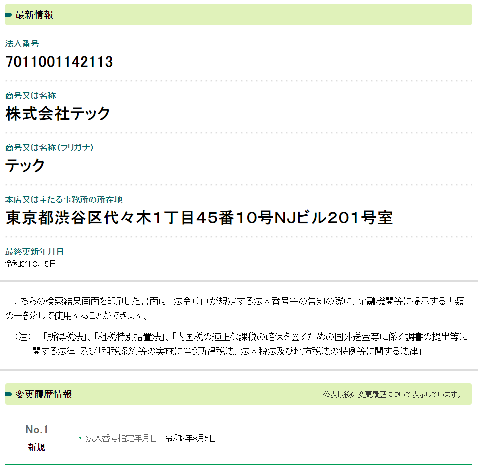 国税庁のサイトで調査してみると、株式会社テックは2021年8月5日に法人番号の指定を受けた、設立されたばかりの法人でした。