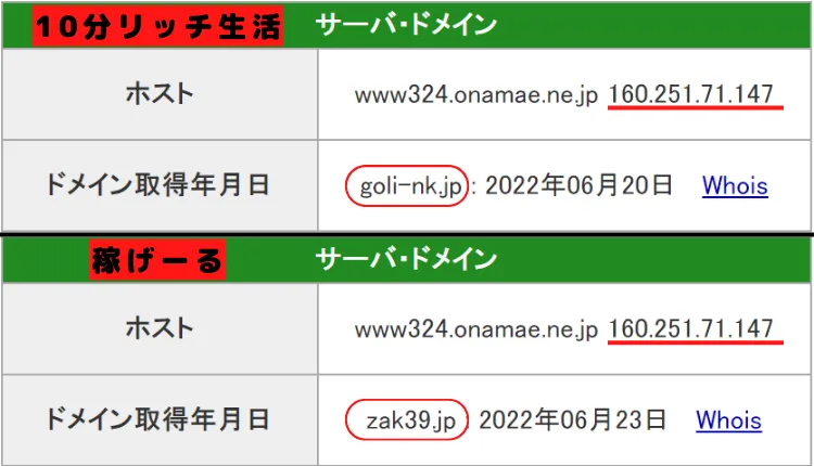 画像上が合同会社リンクのAIジョブパートナーズ、下が株式会社H・Sの稼げーるという副業サイトのIPアドレスです。