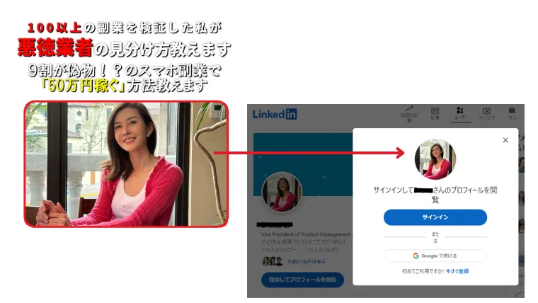 SNSで拾った他人の画像を悪用しており、詐欺まがいな案件へ誘導する偽善者。