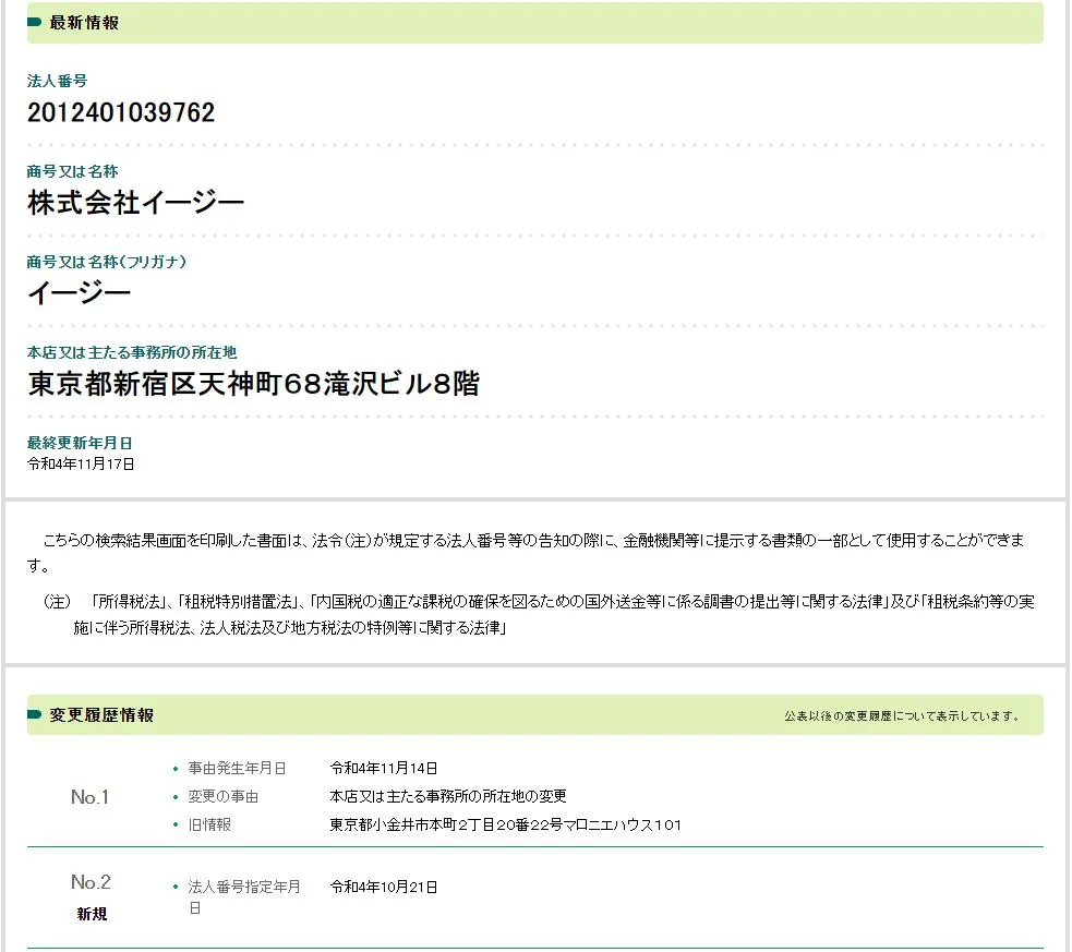 2022年10月21日に法人番号指定されたばかりの新しい会社だと判明しました。