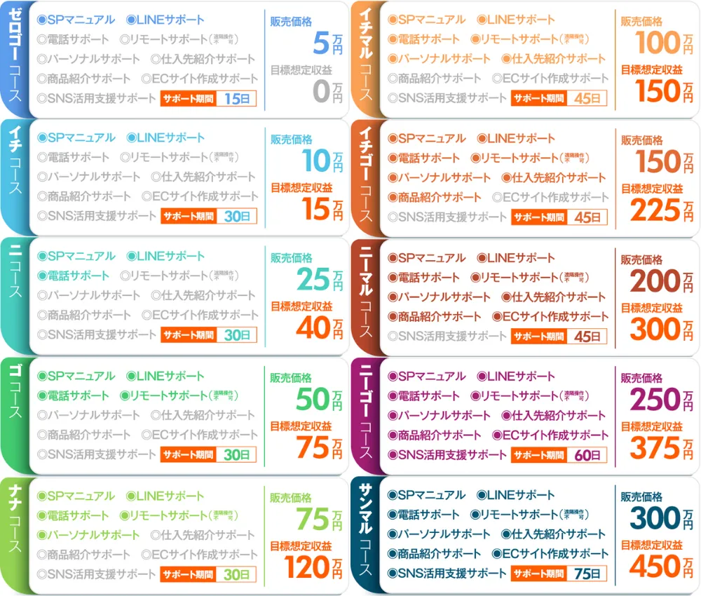どういった品物をどのようなルートで仕入れるのか不明ですが、仕入先紹介サポートは100万円以上のプランへの契約が必要です。