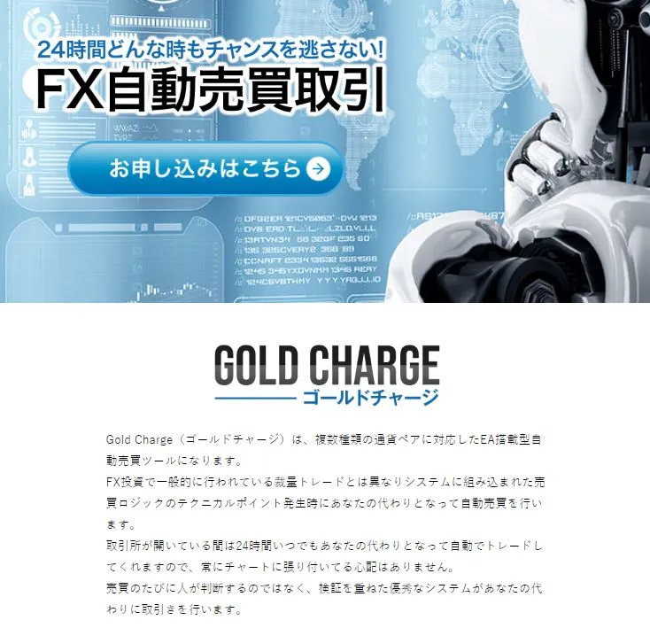 公式サイトでは明かされていない仕事内容とは「ゴールドチャージ」という自動売買ツールを用いたFX投資です。