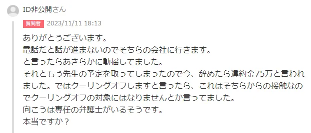 さらには契約前にも関わらず、違約金の名目で75万円の大金の支払いを迫るという恐喝まがいのことをしてくる業者なので、注意が必要です。