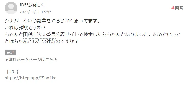さらにトーク画面を見ていくと、副業への参加ボタンが表示され、それを押すとシナジーの公式LINEに案内されます。