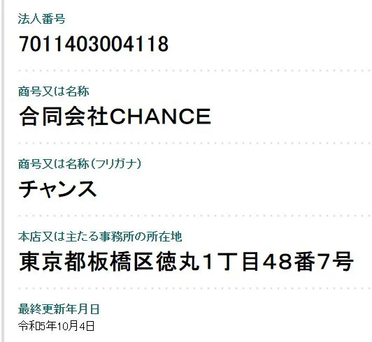 なんと、合同会社CHANCEは「令和5年10月4日」に設立した会社で設立から2ヶ月しか経っていませんでした。