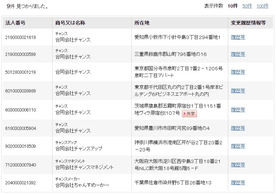 国税局の法人番号検索サイトで「合同会社チャンス」と検索すると、それらしき会社情報は出てきませんでした。