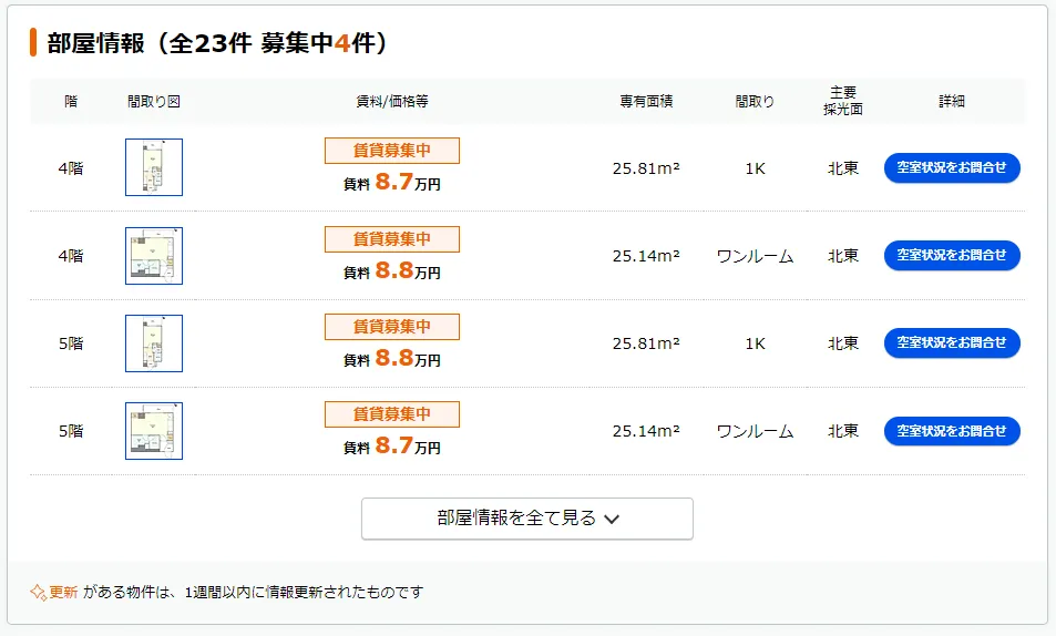 建物の募集要項から、部屋の広さは約25㎡の1Kと判明しました。